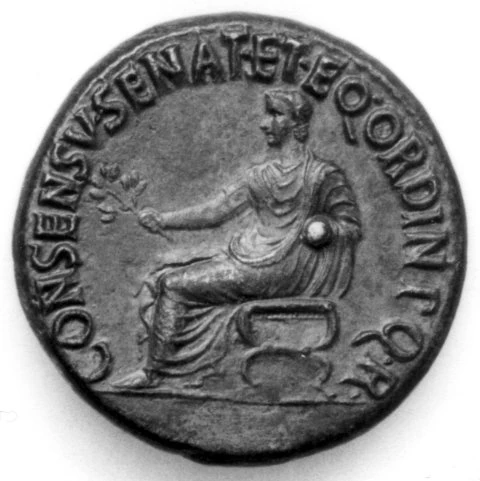 Gaius Julius Caesar Germanicus was built-in in A.D. 12. His birthplace was most probably Antium (mod day Anzio).1 He won his nickname Caligula or "lilliputian kicking" (caliga) by way of the army, because he grew up among the troops and wore the miniature compatible of a private soldier. According to ancient biographers Caligula'southward physical features were unusual and far from handsome. Seneca, a gimmicky of Caligula, writing after the Emperor's death, described him in this way: "So repulsive was the whiteness of his face, which showed mad escapades, so haggard were his eyes hidden under his brow, which like that of an old man, and and then large was the repulsiveness of this baldness of his head which was only partly covered with hair, his legs were thin and his enourmous."2 While this type of evidence is helpful for an idea of Caligula's general appearance, it is not useful for understanding of what Caligula may have actually looked similar. Images on the coinage of Caligula, therefore, will become an important part of bringing the portraiture of Caligula together, besides as iconographical and literary evidence. Portraits tend to depict Caligula equally the idealized Julio-Claudian Princeps. Caligula placed bully importance on his famous family, and and so begins the work of a propagandist. On coinage struck during Caligula's reign we find a pattern of well-thought-out imagery on both the obverses and reverses of all of his coinage. Most notably-and what this study attempsts to recognize- is the seated effigy on the reverse of the consensv dupondius.3 In the historical Museum of Bern. The Bern piece is clearly meant to represent Caligula, and non Augustus, equally has been believed for many years by numismatists and scholars of art history.4